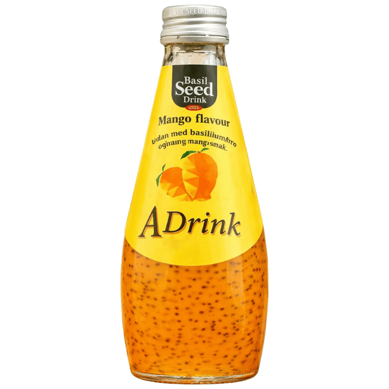A-Drink basilikumfrødrikk med mango 290ml. Forfriskende drikk med ekte basilikumfrø og fyldig, tropisk mangosmak. Kjent for sin karakteristiske tekstur og lett sødme. Perfekt som tørstedrikk på farten eller som et spennende alternativ til vanlige fruktdrikker. Serveres best godt avkjølt.