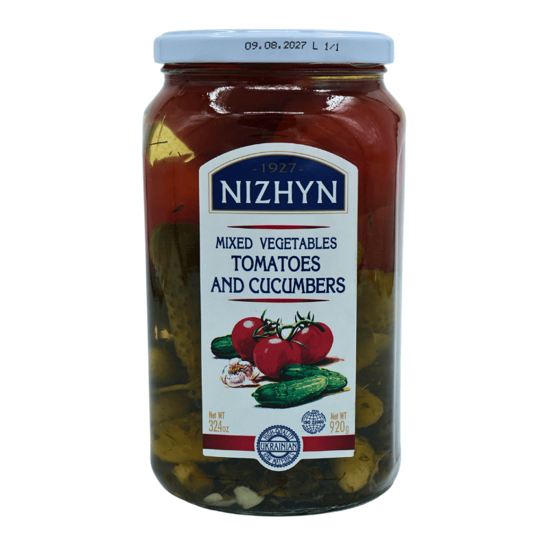 Assporti Nizhyn syltede agurk og tomat 920g kombinerer sprø småagurker og saftige tomater i en delikat eddiklake med urter og krydder. Passer perfekt som tilbehør til kjøttretter, grillmat eller som en smakfull forrett. Leveres i praktisk glasskrukke – ideell for deling.