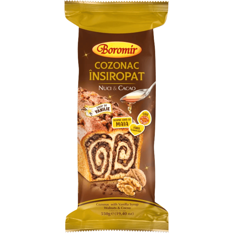 Boromir søtt brød med sirup, valnøtter og kakao 550g. Mykt og saftig søtbrød dynket med sirup og fylt med valnøtter og kakao, som gir en rik, fyldig og lett sjokoladeaktig smak. Passer godt til kaffe og te, som dessert eller ved spesielle anledninger.