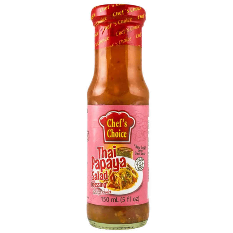 Chef’s Choice thailandsk papayasalat dressing 150ml. Autentisk dressing laget for Som Tam (thai papayasalat), med balansert kombinasjon av syrlighet, chili, sødme og umami. Perfekt også til asiatiske salater, nudelsalater og som marinade når du ønsker frisk og krydret thaismak.