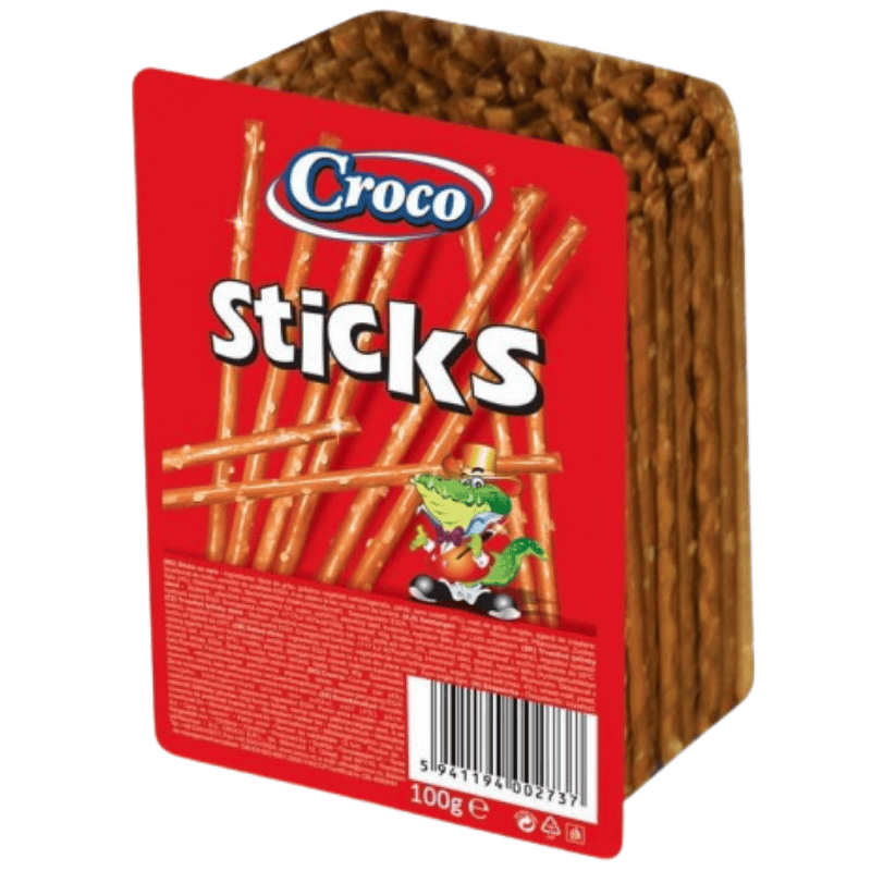 Croco Sticks 100g. Klassiske, sprø saltstenger pakket i praktisk boks. Perfekt som snacks, til dipping eller som tilbehør til sammenkomster og filmkvelder.