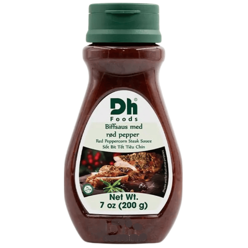 DH BBQ saus med røde pepperkorn 200g. Fyldig og aromatisk saus med lett sterk og krydret smak. Perfekt til grillet kjøtt, kylling, biff og grønnsaker, eller som marinade og glaze for ekstra dybde og BBQ-karakter.