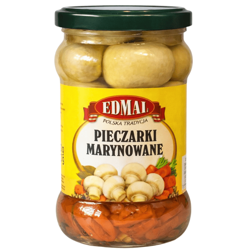 Edmal syltede sjampinjonger 290ml. Små og smakfulle sjampinjonger syltet i mild lake som gir en balansert syrlig smak. Perfekt som tapas, tilbehør til kjøtt- og grillretter, på pizzabordet eller som ingrediens i salater og kalde retter. Klar til servering og enkel å bruke.