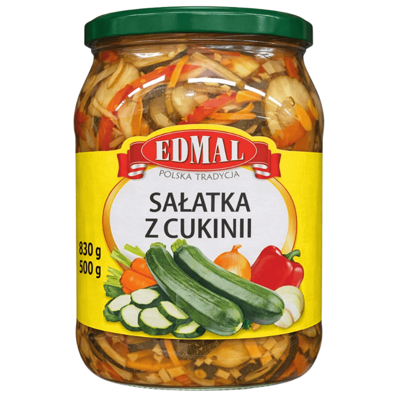 Edmal zucchinisalat 820g. Skivet zucchini i aromatisk eddiklake med balansert syrlig og lett sødmefull smak. Egner seg godt som tilbehør til kjøttretter, grillmat, smørbrød og som del av tapas og kalde retter.
