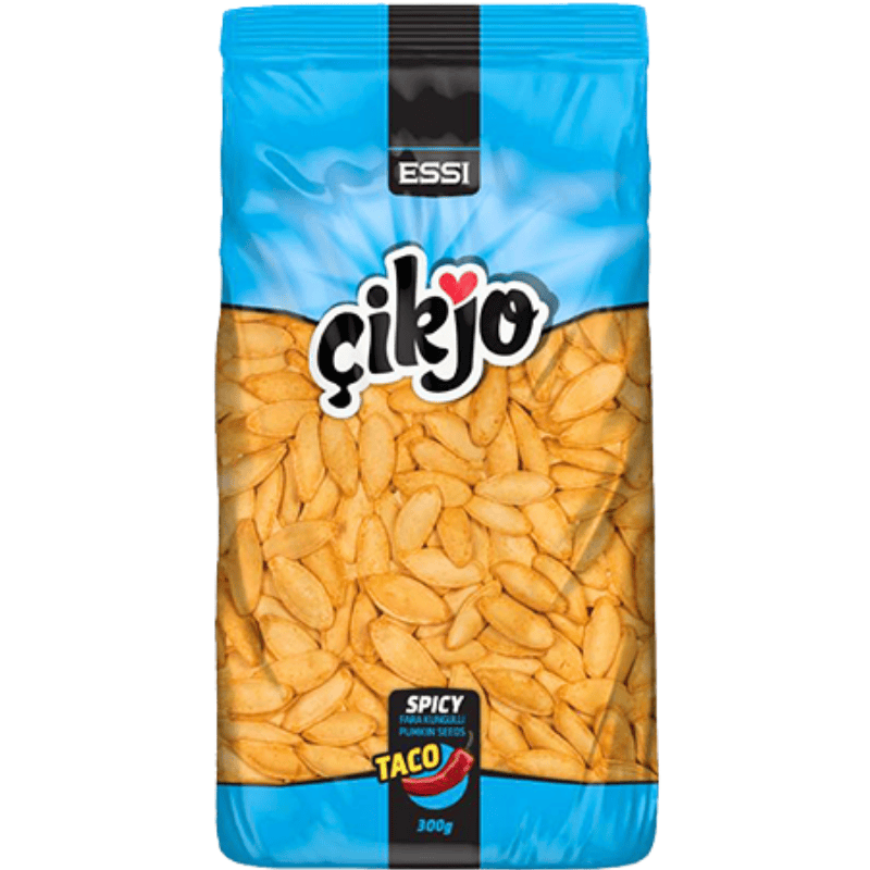 ESSI Cikjo gresskarfrø med tacosmak 300g. Sprø ristede gresskarfrø krydret med smakfull tacosmak som gir en balansert kombinasjon av nøtteaktig crunch og krydret smak. Perfekt som snacks til hverdags, til filmkvelden eller som et spennende alternativ til chips.