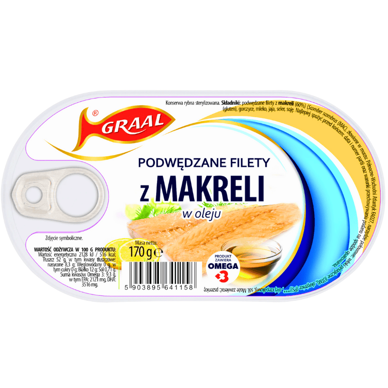 Graal makrellfileter i olje 170g. Møre makrellfileter konservert i olje for å bevare saftighet og naturlig smak. Perfekt som pålegg, til smørbrød, salater eller som ingrediens i enkle og raske måltider. En naturlig kilde til protein og omega-3 fettsyrer.