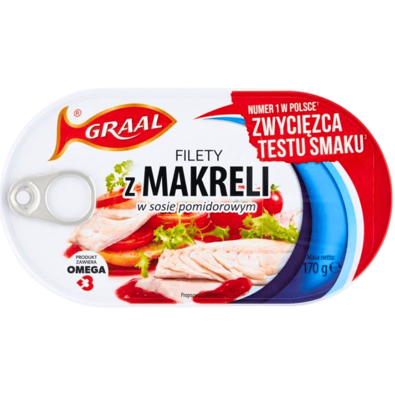 Graal makrellfileter i tomatsaus 170g. Møre og saftige makrellfileter i fyldig tomatsaus med balansert smak. Perfekt som pålegg, til smørbrød, salater eller som en rask og enkel middag sammen med pasta, ris eller poteter. Naturlig rik på protein og omega-3 fettsyrer.