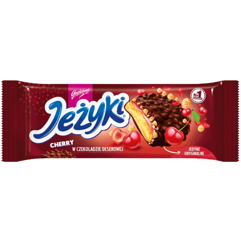 Jezyki Cherry kjeks i mørk sjokolade 140g. Sprø kjeks toppet med cornflakes og nøttebiter, kombinert med kirsebærsmak og dekket med fyldig mørk sjokolade. En balansert kombinasjon av fruktig syrlighet og intens sjokoladesmak, perfekt til kaffe, te eller som snacks.