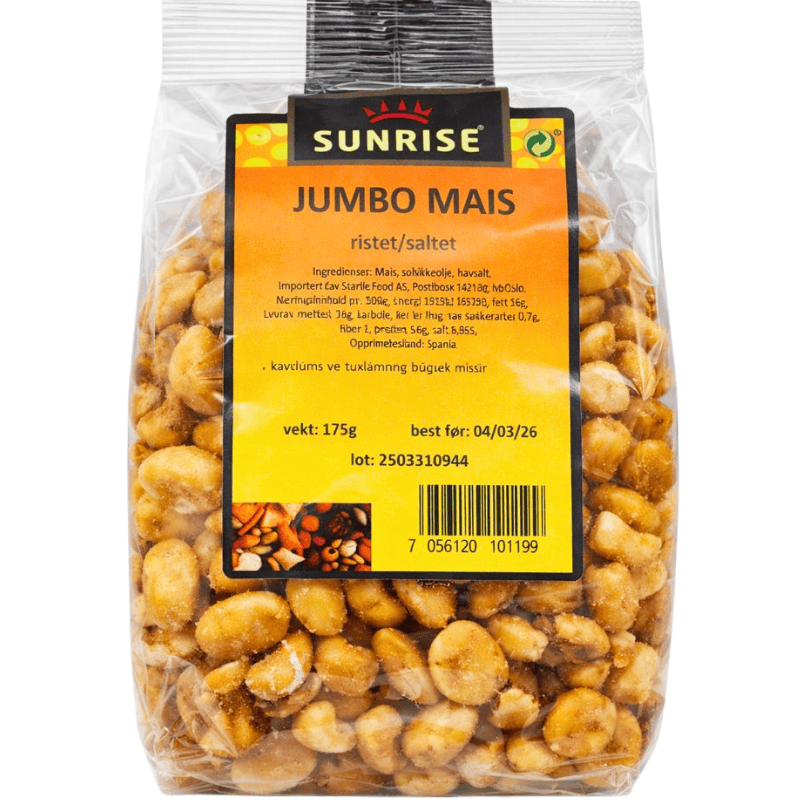 Jumbo mais ristet og saltet 195g. Sprø og smakfull snack laget av store maiskjerner, ristet til gyllen konsistens og lett saltet. Perfekt som snacks til hverdags, til filmkvelden eller som et alternativ til chips og nøtter. Gir god crunch og fyldig maissmak.