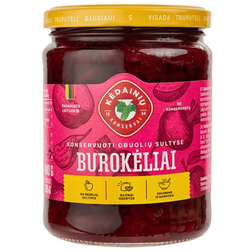 Kedainiu rødbeter med eple «Burokeliai» 480g. Skivede rødbeter blandet med eple i aromatisk lake, med balansert syrlig og lett sødmefull smak. Passer godt som tilbehør til kjøttretter, salater, smørbrød og tradisjonelle østeuropeiske retter.