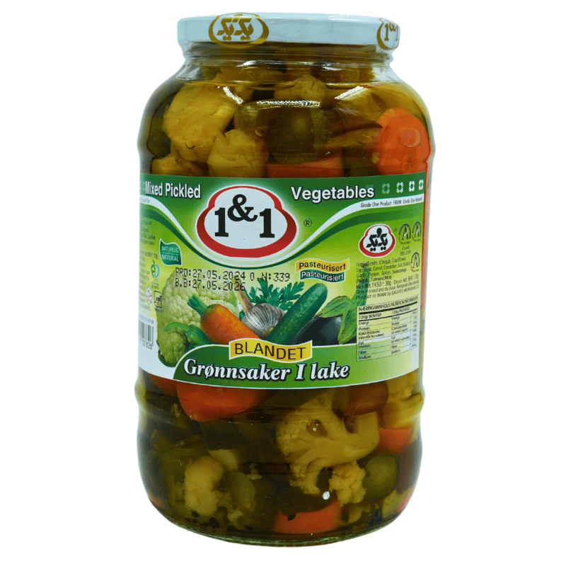 1&1 syltede blandede grønnsaker 1450g er en tradisjonell miks av sprø agurk, gulrot, blomkål og paprika konservert i mild lake. Perfekt som siderett til middager, grillmat eller som snacks. Leveres i stor glasskrukke – ideell for familier og til festbordet.