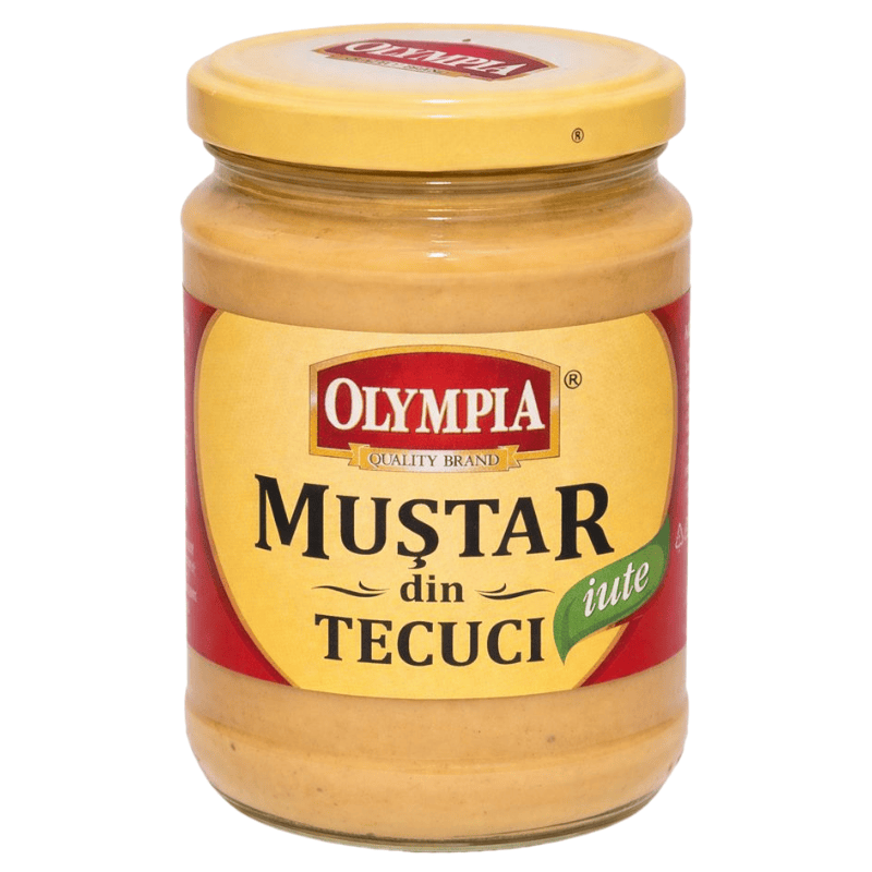 Olympia sennep sterk Din Tecuci 300g. Sterk rumensk sennep med kraftig og krydret smak og tydelig aromatisk preg. Passer godt til pølser, kjøttretter, grillmat, smørbrød og som ingrediens i sauser og marinader.