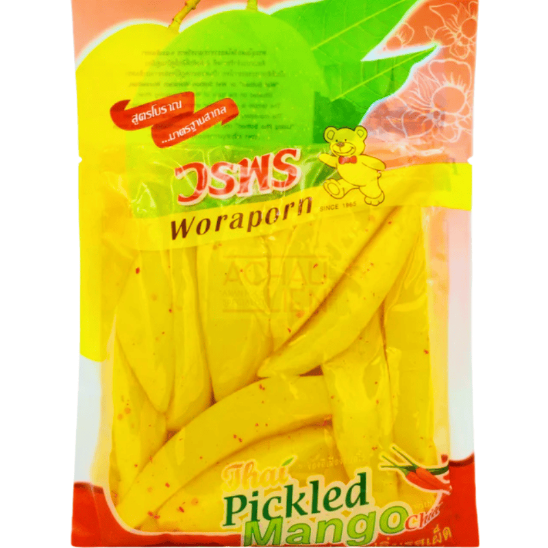 Woraporn syltet mango med chili 300g. Tradisjonell thailandsk snack og tilbehør laget av grønn mango syltet med chili for en frisk, syrlig og lett sterk smak. Perfekt som snack, til risretter, grillet kjøtt eller som smakfull siderett i thailandsk mat. Gir balansert kombinasjon av syrlighet, sødme og chili.