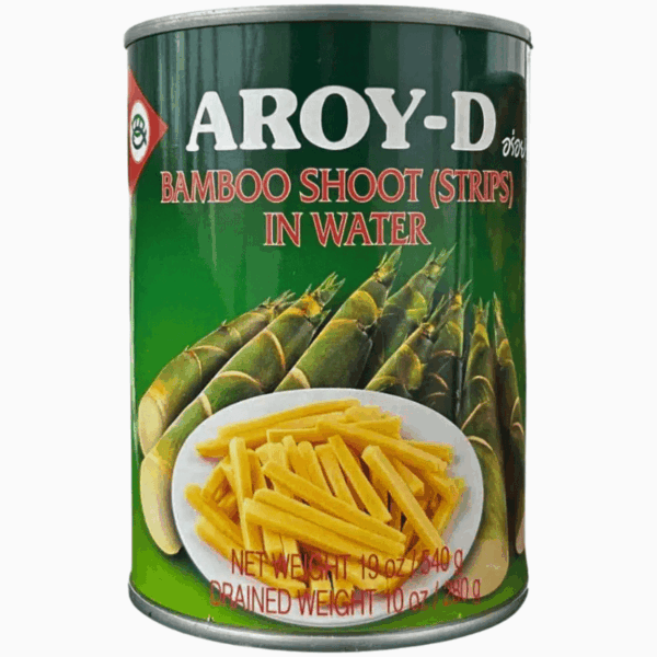 Aroy-D Bambusskudd Strimler 540g – ferske og sprø bambusskudd i praktiske strimler, perfekte for supper, wok og asiatiske retter.