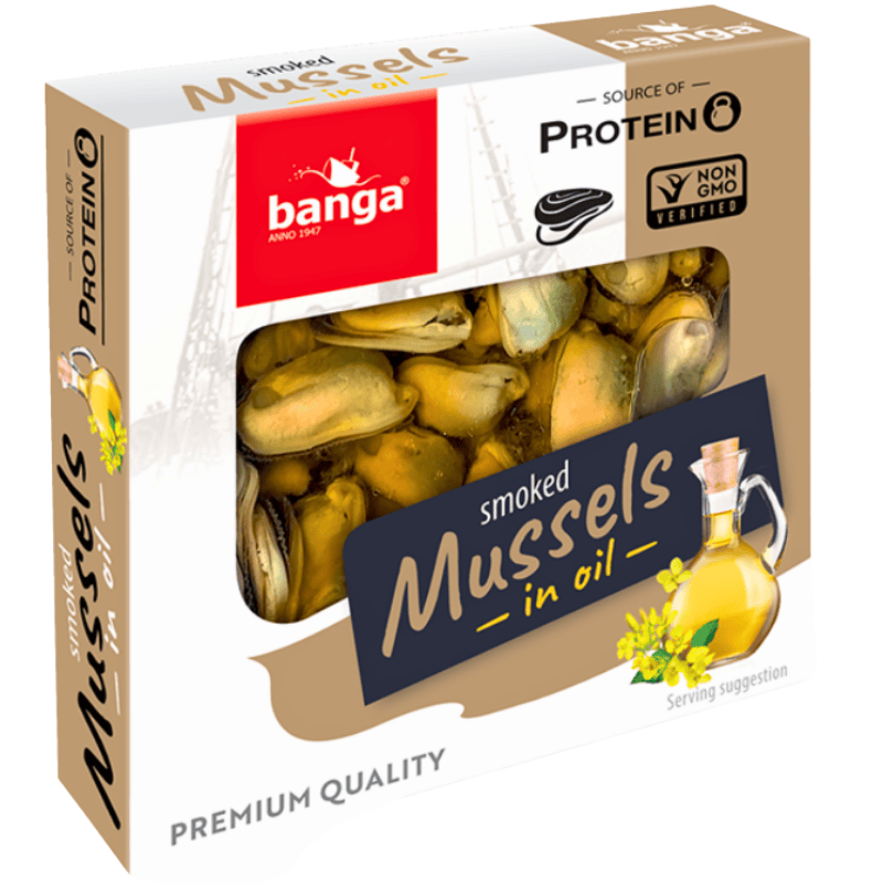 Banga røkte muslinger i olje 120g. Delikate muslinger lett røkt for fyldig smak og konservert i olje for saftig konsistens. Perfekt som tapas, forrett, pålegg eller som smakfull ingrediens i salater og pastaretter. Gir rik sjøsmak og passer godt til middelhavsinspirerte retter.