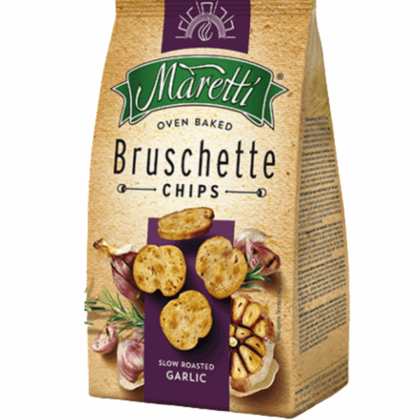 Bruschette slow roasted garlic 70g. Sprø ovnsbakte brødchips med smak av langsomt ovnsstekt hvitløk, som gir en fyldig og aromatisk smak. Passer godt som snacks, til dip, salater eller som tilbehør til supper og antipasti.