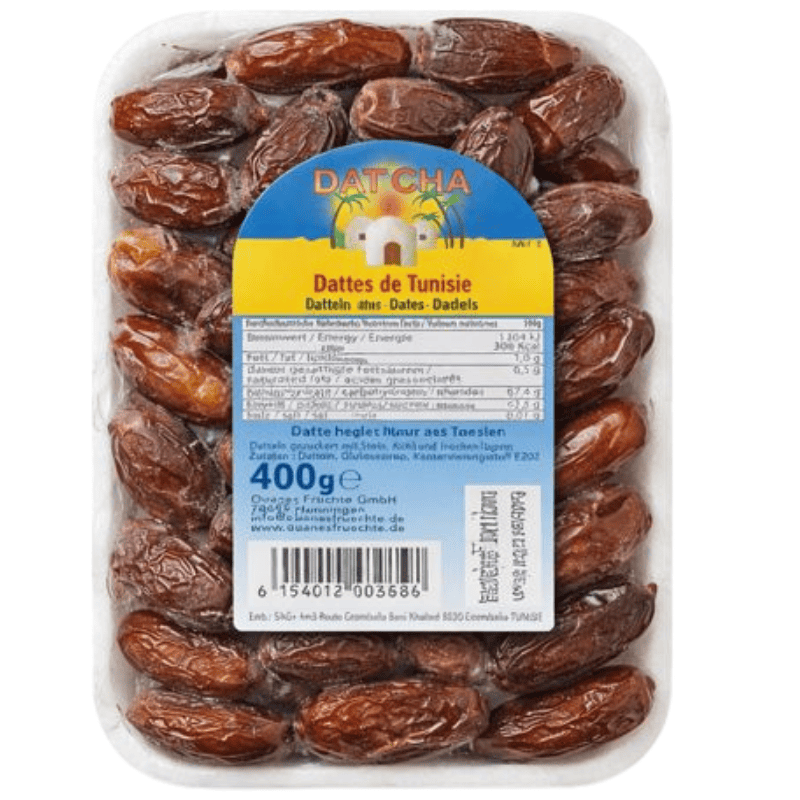 Dadler fra Tunisia 400g. Søte og myke dadler med naturlig karamellaktig smak og saftig konsistens. Passer godt som snacks, til baking, desserter, smoothies og frokostblandinger.