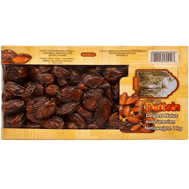 Dadler fra Tunisia i syrup 1kg. Hele dadler konservert i lett sukkerlake som gir ekstra saftig konsistens og fyldig sødme. Passer godt som dessert, til servering med yoghurt og ost, i bakverk eller som søtt innslag i orientalske retter. Storpakning egnet for både husholdning og profesjonell bruk.