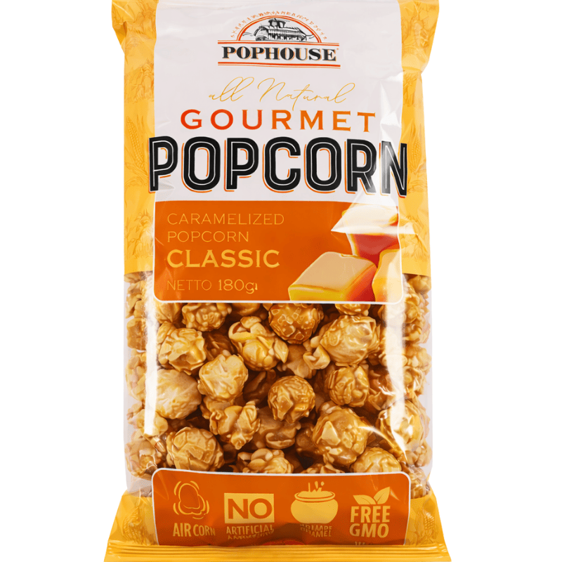 Gourmet karamellisert popcorn Classic 180g. Sprø popcorn dekket med gyllen karamellglasur som gir en rik, søt og knasende smak. Perfekt til filmkvelder, dessertservering eller som en luksuriøs søt snacks.