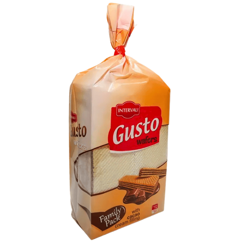 Gusto wafers med kakaokrem 630g. Sprø lagdelte vaffelkjeks fylt med fyldig kakaokrem som gir en balansert kombinasjon av lett crunch og kremet sjokoladesmak. Egner seg godt til kaffe, te, dessertservering eller som søt snacks i storpakning.