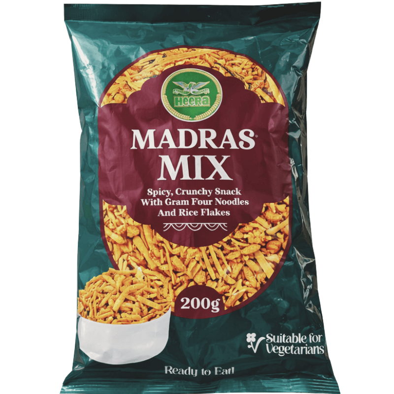 Heera Snacks Madras Mix 200g. Klassisk indisk snacksmiks inspirert av Madras-kjøkkenet, med sprø linser, nudler, peanøtter og aromatiske krydder. Gir en fyldig, lett sterk og crunchy snackopplevelse. Passer godt som snacks alene eller til te.