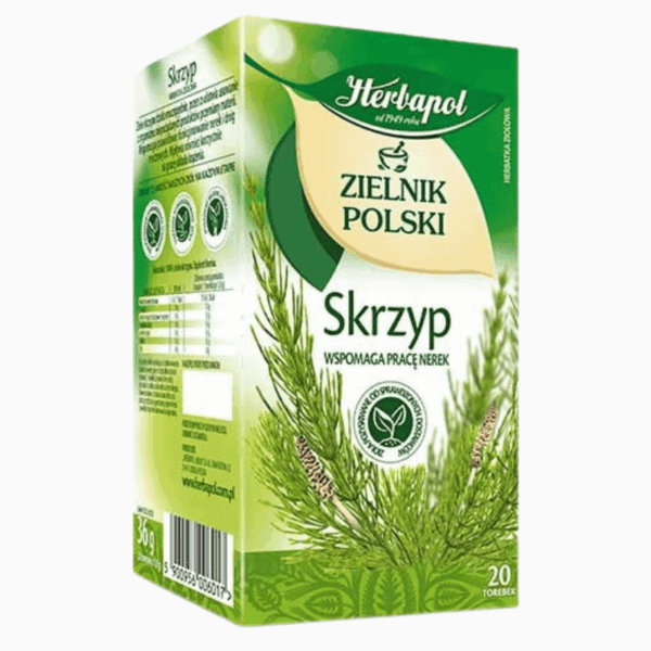 Herbapol kjerringrokk urtete er en naturlig urtete laget av kjerringrokk (åkersnelle), tradisjonelt brukt for å støtte urinveiene og styrke hår og negler. Pakken inneholder 20 teposer à 1,8g. Total vekt: 36g.