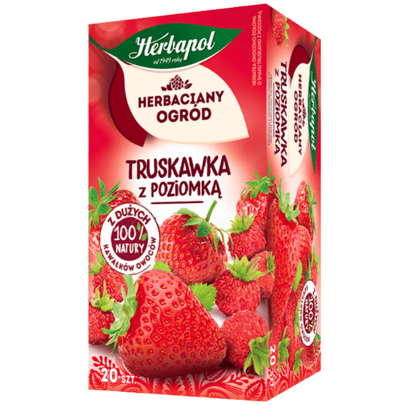 Herbapol Strawberry Fruit & Herbal Tea 20×2.5g. Frukt- og urtete med smak av jordbær, med frisk og søt bæraroma. Passer godt som en varm og aromatisk drikk gjennom dagen. Pakken inneholder 20 praktiske teposer.
