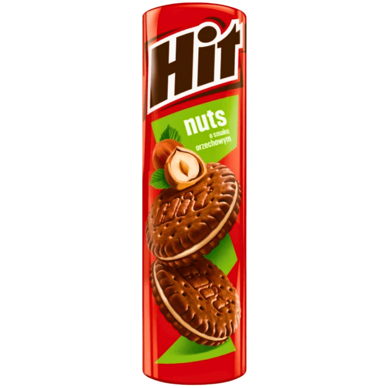 Hit biscuits med nøttesmak 220g. Sprø kjeks fylt med kremet nøttefyll som gir en balansert kombinasjon av sødme og crunch. Perfekt til kaffe og te, som snack i hverdagen eller til deling med familie og venner. Et populært valg blant klassiske fylte kjeks.