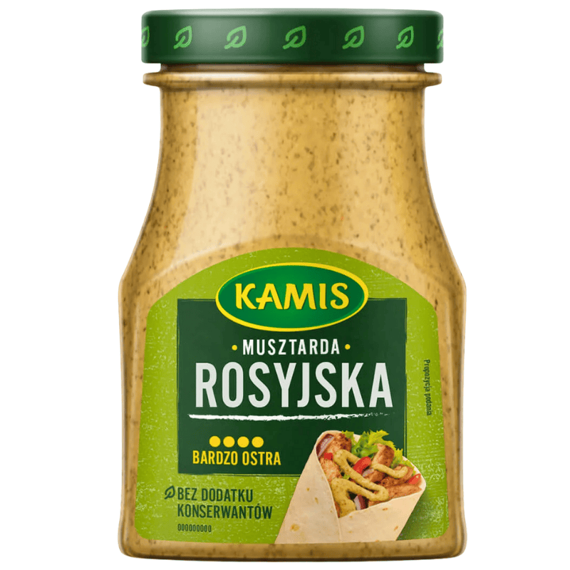 Kamis sennep «Rosyjska» 180g. Klassisk russisk-inspirert sennep med kraftig styrke og karakteristisk krydret og syrlig smak. Passer godt til pølser, kjøttretter, grillmat, smørbrød og som ingrediens i sauser og marinader.