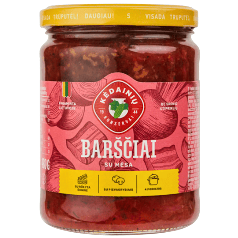 Kedainiu borsch med steinsopp 480g. Tradisjonell rødbetbasert borsch-suppe med aromatisk steinsopp, med fyldig og lett syrlig smak. Egner seg godt som ferdig suppe eller som base til varme retter. Klar til oppvarming og servering.