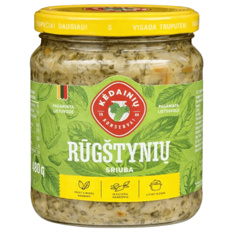 Kedainiu suppe med engsyre og bacon 480g. Tradisjonell østeuropeisk suppe med engsyre og bacon, med fyldig, aromatisk og lett syrlig smak. Egner seg godt som ferdig suppe eller som base til varme retter. Klar til oppvarming og servering.