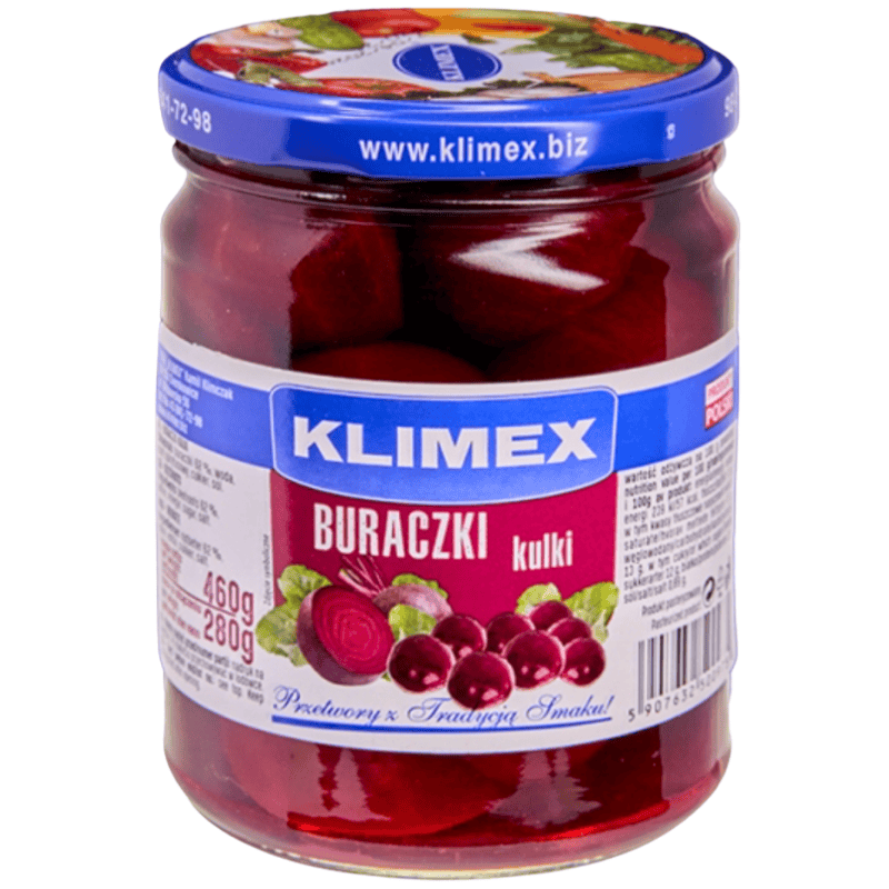 Klimex hele rødbeter «Kulki» 460g. Hele rødbeter konservert i aromatisk lake med balansert syrlig og lett sødmefull smak. Egner seg godt som tilbehør til kjøttretter, salater, smørbrød og tradisjonelle kalde retter. Klar til bruk.