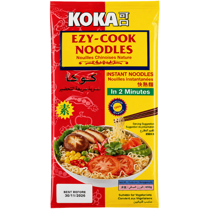 Koka Ezy-Cook Plain Noodles er forhåndskokte hvetenudler utviklet for rask tilberedning. Nudlene trenger kun kort oppvarming og gir en myk og elastisk tekstur etter tilberedning. Egner seg godt til wok, supper og raske nudelretter med ulike sauser og ingredienser.