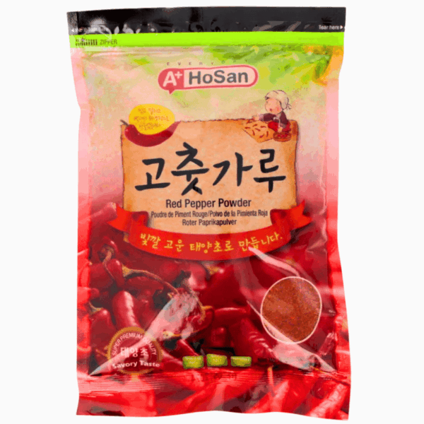 Sterkt og grovmalt koreansk chilipepperpulver (gochugaru) – uunnværlig i kimchi, bulgogi og andre klassiske koreanske retter. Gir intens varme og dyp rød farge. Vekt: 500 g.