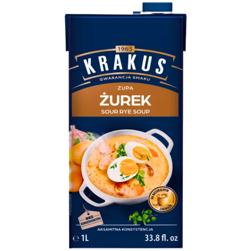 Krakus suppe zurek 1L. Tradisjonell polsk żurek-suppe laget med fermentert rugmel, kjent for sin karakteristiske syrlige og aromatiske smak. Passer godt som ferdig suppe eller som base til klassiske polske retter med pølse, egg og poteter.