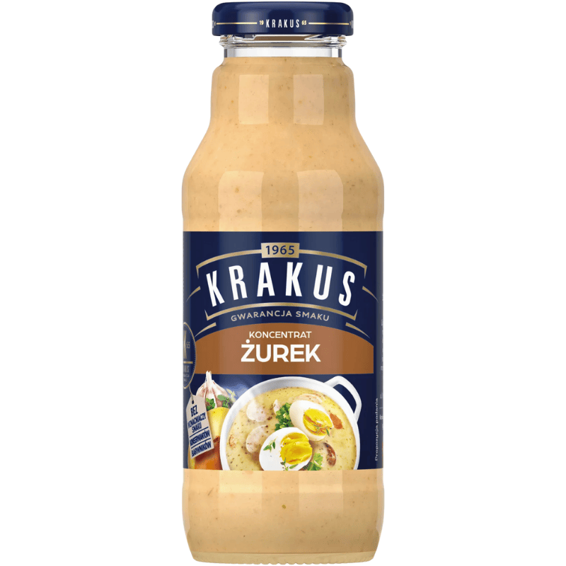 Krakus zurek 300ml. Tradisjonell polsk suppebase laget av fermentert rugmel, kjent for sin karakteristiske syrlige og aromatiske smak. Brukes som base til klassisk żurek-suppe med pølse, egg og poteter, eller som smakstilsetning i gryteretter og supper.