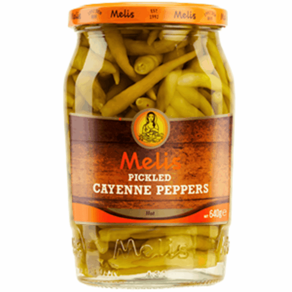 Melis pickled hot cayenne 720g. Sterke cayennepepper konservert i lake, med frisk syrlighet og intens hete. Passer godt til grillretter, kebab, pizza, salater og som krydret tilbehør til varme og kalde retter.