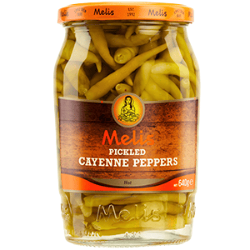 Melis sterk cayenne pepper 1500g. Sterke cayennepepper konservert i lake, med frisk syrlighet og intens hete. Passer godt til grillretter, kebab, pizza, salater og som krydret tilbehør til både varme og kalde retter. Storpakning.