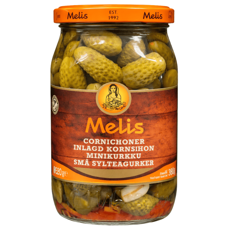 Melis syltet kornishon agurk 720ml. Små og sprø kornishon-agurker konservert i lake med balansert syrlig og lett søt smak. Passer godt til smørbrød, burgere, salater, tapas og som tilbehør til kjøtt- og grillretter. Praktisk større glass.