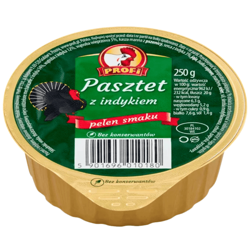 Profi kalkunpostei 250g. Mild og smørbar postei laget av kalkunkjøtt, med balansert smak og kremet konsistens. Perfekt som pålegg på brød og knekkebrød, i matpakken eller som del av kalde retter. Et lettere alternativ til tradisjonell postei, godt egnet til daglig bruk.