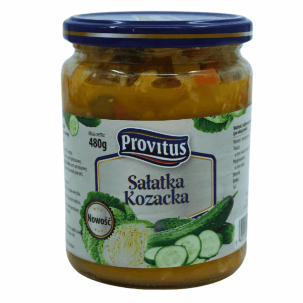 Provitus salatka kozacka er en tradisjonell polsk salat laget av blandede grønnsaker som agurk, gulrot og kål i en smaksrik marinade. Perfekt som tilbehør til kjøttretter, smørbrød og grillmat. Pakken inneholder 480 gram.