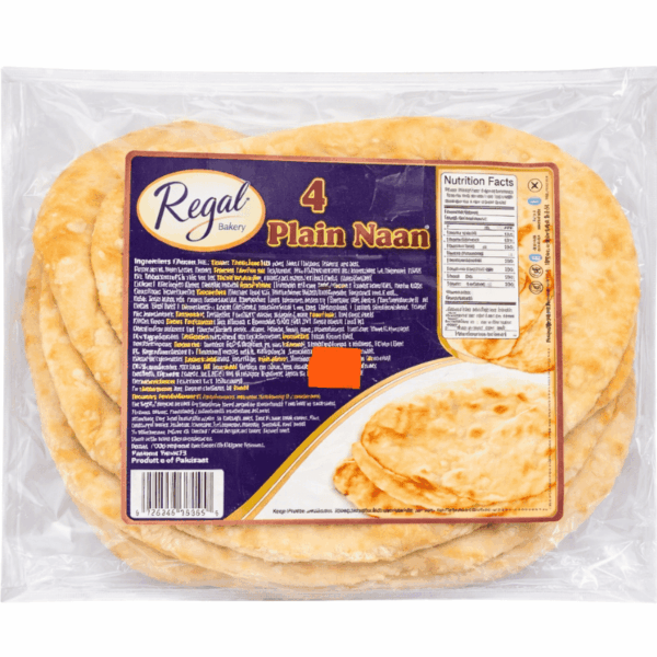 Regal plain naan 4 stk. Mykt og luftig indisk naanbrød, perfekt som tilbehør til curryretter, gryter, tikka masala og annen indisk og asiatisk mat. Kan varmes raskt i ovn eller panne og serveres varmt for best smak og konsistens.