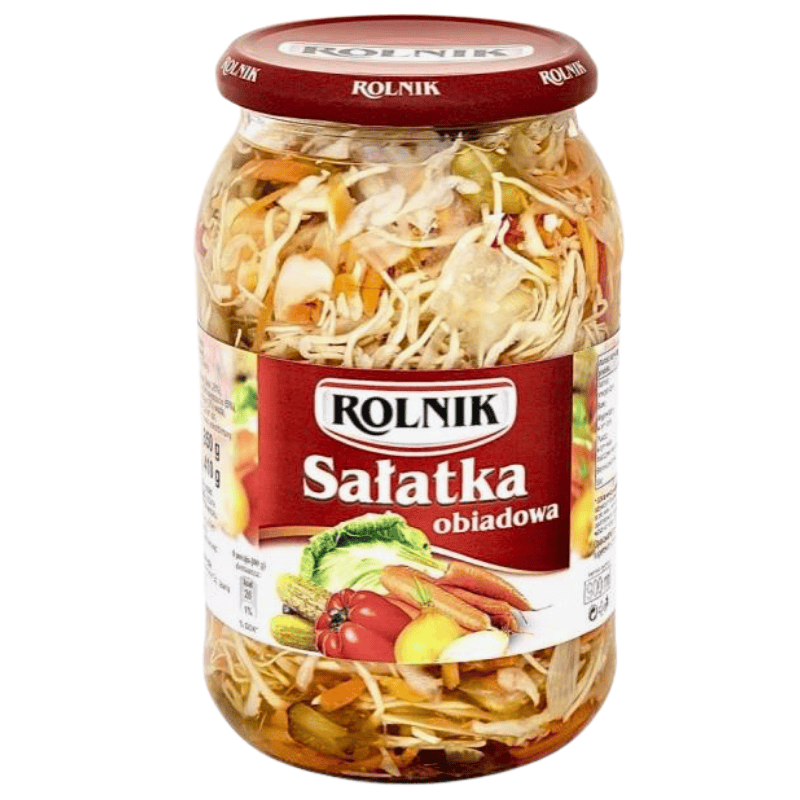 Rolnik salatka obiadowa 900 ml. Tradisjonell polsk grønnsakssalat med kål, gulrot og andre grønnsaker i aromatisk eddiklake, med balansert syrlig og lett sødmefull smak. Egner seg godt som tilbehør til kjøttretter, grillmat og tradisjonelle middager. Klar til bruk.