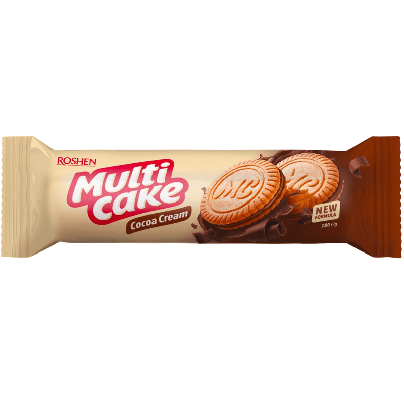 Roshen Multicake kjeks med kakaokrem 180g. Myke lagdelte kjeks fylt med fyldig kakaokrem som gir en balansert kombinasjon av kremet tekstur og rik sjokoladesmak. Passer godt til kaffe, te eller som en liten dessert og snacks.