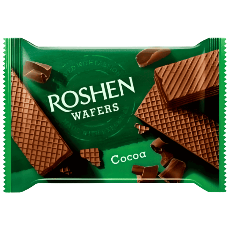 Roshen vafler med kakaofyll 72g. Sprø lagdelte vaffelkjeks fylt med fyldig kakaokrem, som gir en balansert kombinasjon av lett crunch og rik sjokoladesmak. Passer godt som snacks, til kaffe eller te.