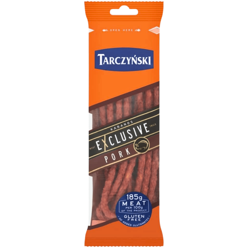 Tarczynski kabanos “Wieprzowy” 105g. Klassiske kabanospølser laget av svinekjøtt, med tydelig krydret smak og fast, sprø konsistens. Perfekt som snack, i matpakken eller på farten. Et populært valg for deg som liker tradisjonell kabanos med rik kjøttsmak.